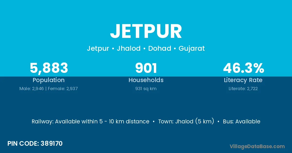 Rajpipla (24 km) is the nearest town to Jetpur village for major economic activities and is located approximately 24 km away.