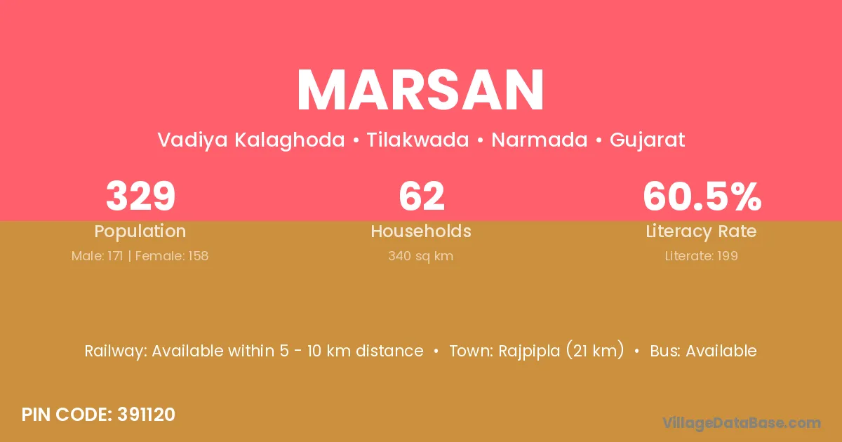 Rajpipla (21 km) is the nearest town to Marsan village for major economic activities and is located approximately 21 km away.