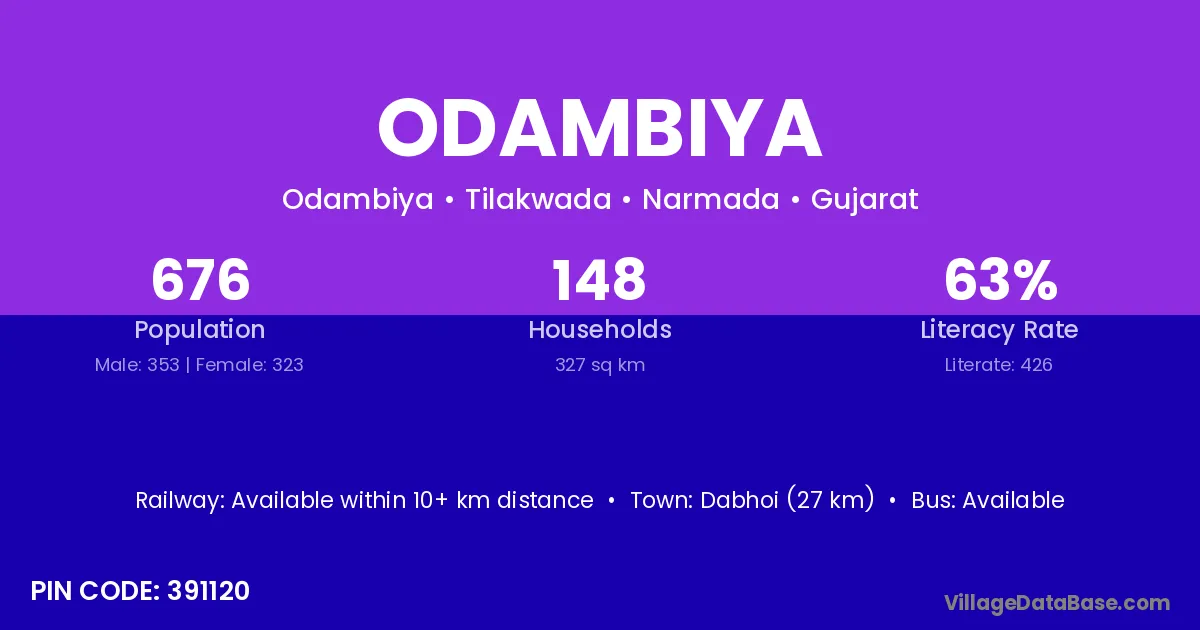 Dabhoi (27 km) is the nearest town to Odambiya village for major economic activities and is located approximately 27 km away.