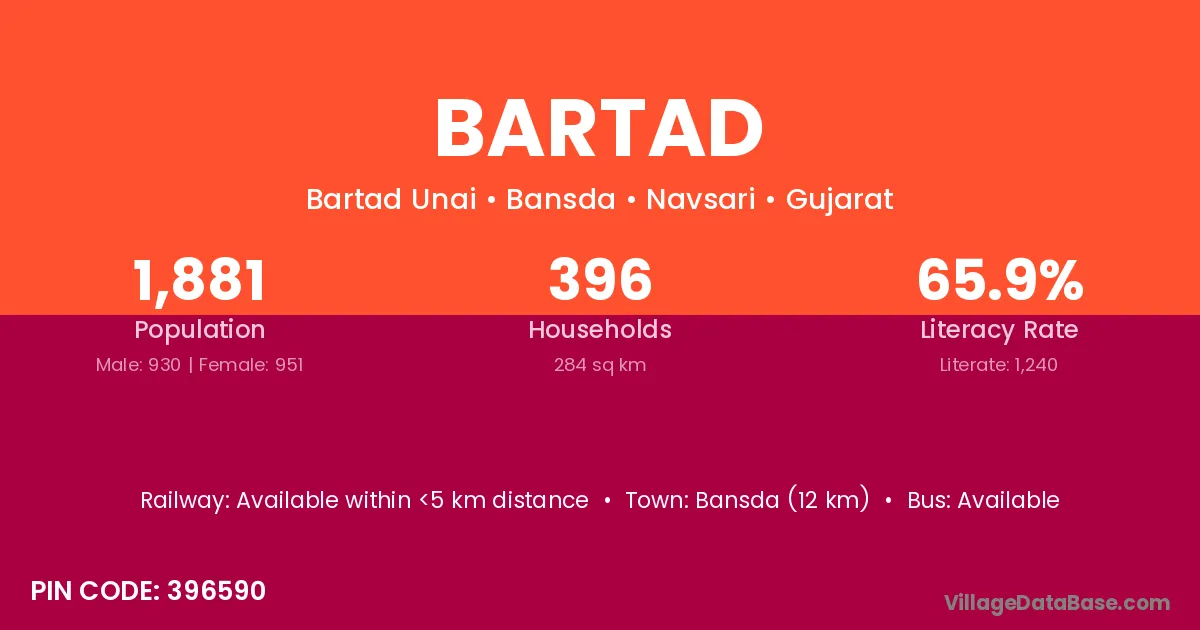 Bansda (12 km) is the nearest town to Bartad village for major economic activities and is located approximately 12 km away.