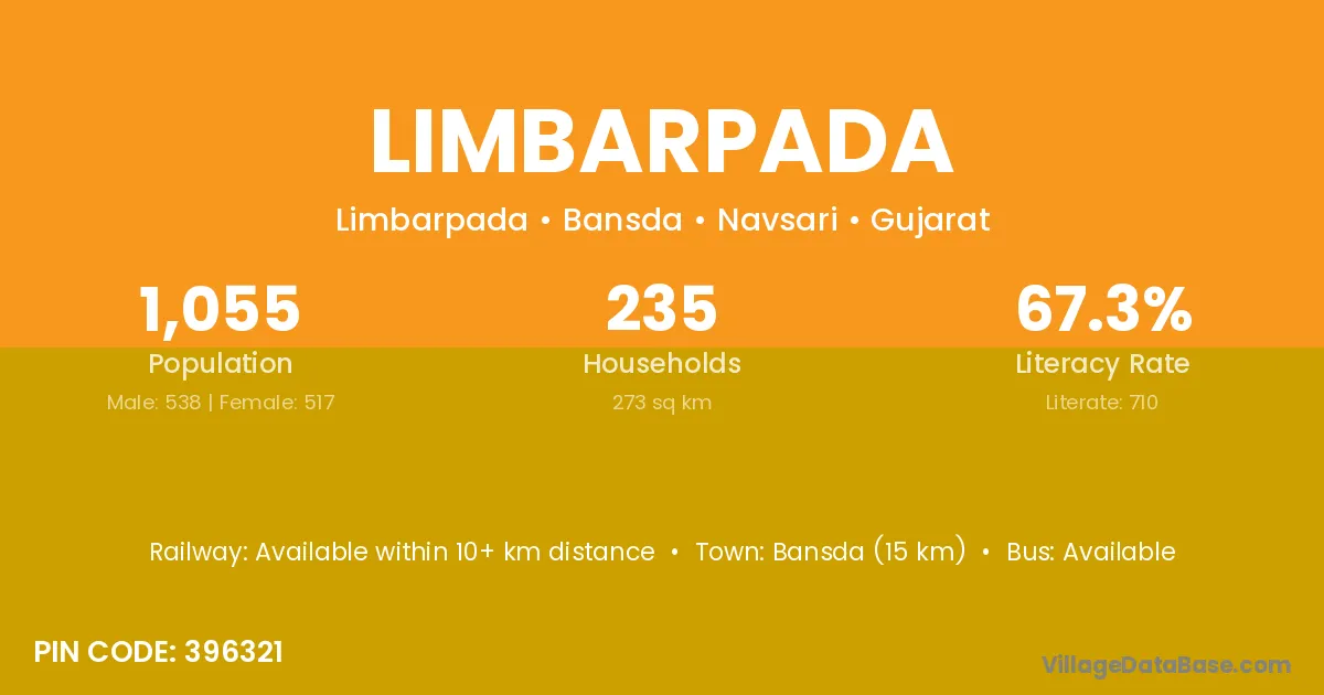 Bansda (15 km) is the nearest town to Limbarpada village for major economic activities and is located approximately 15 km away.
