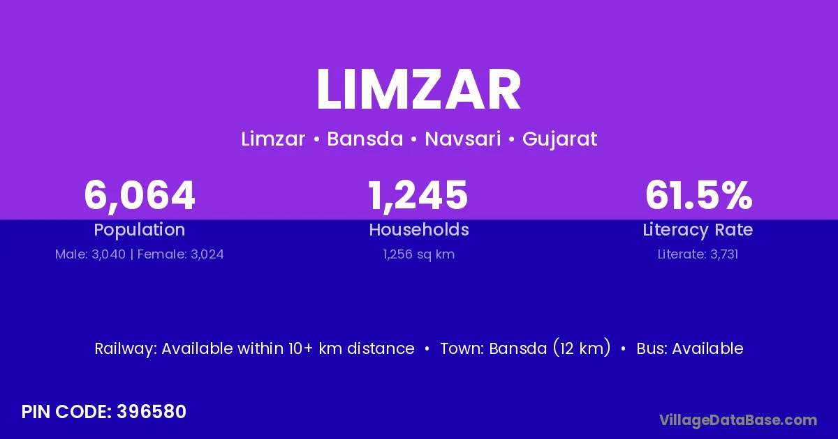 Bansda (12 km) is the nearest town to Limzar village for major economic activities and is located approximately 12 km away.