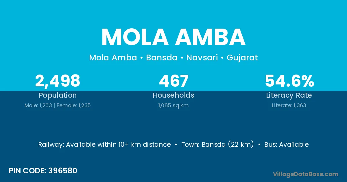 Bansda (22 km) is the nearest town to Mola Amba village for major economic activities and is located approximately 22 km away.