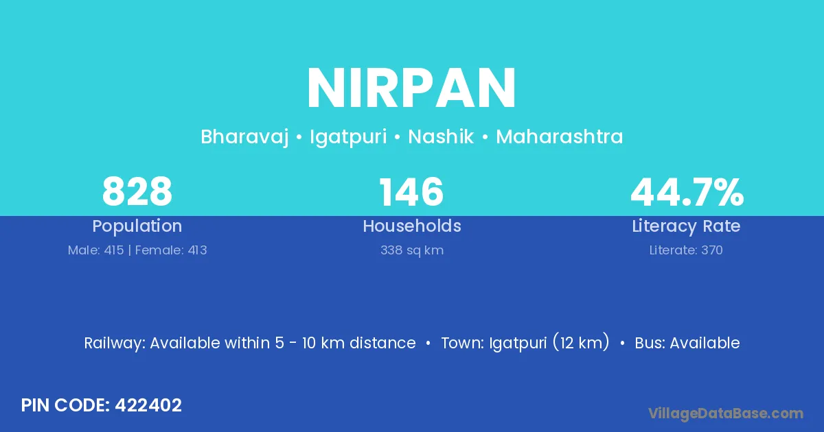 Bansda (30 km) is the nearest town to Nirpan village for major economic activities and is located approximately 30 km away.