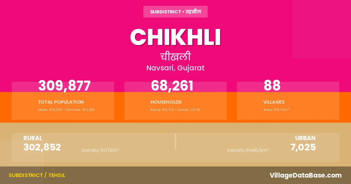 According to the 2011 census The total area of Chikhli Taluka is 587 km², with a population of 309877 people. The population density is 528 inhabitants per square kilometre, and there are approximately 68261 houses in the sub district.