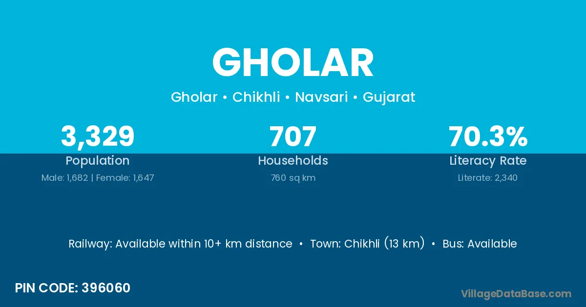 Chikhli (13 km) is the nearest town to Gholar village for major economic activities and is located approximately 13 km away.