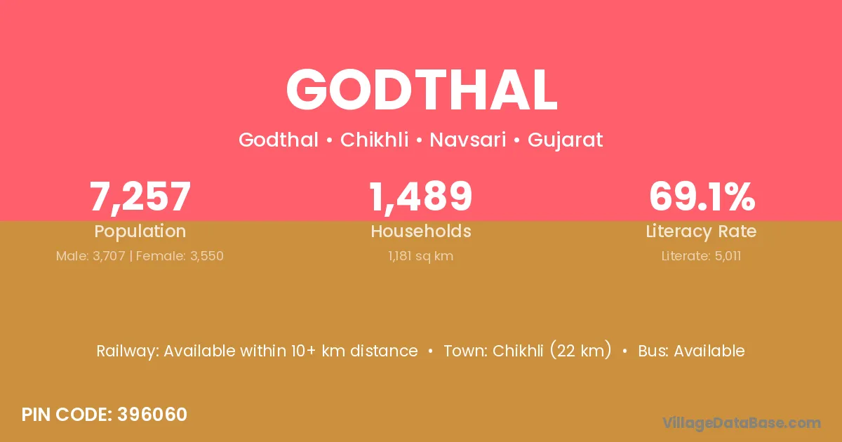 Chikhli (22 km) is the nearest town to Godthal village for major economic activities and is located approximately 22 km away.