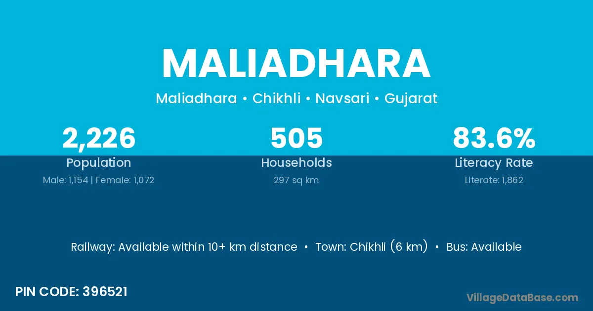 Chikhli (6 km) is the nearest town to Maliadhara village for major economic activities and is located approximately 6 km away.