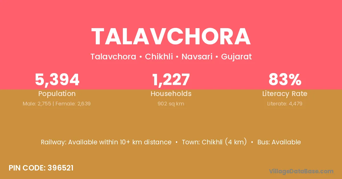 Chikhli (4 km) is the nearest town to Talavchora village for major economic activities and is located approximately 4 km away.