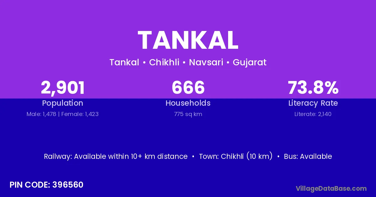 Chikhli (10 km) is the nearest town to Tankal village for major economic activities and is located approximately 10 km away.