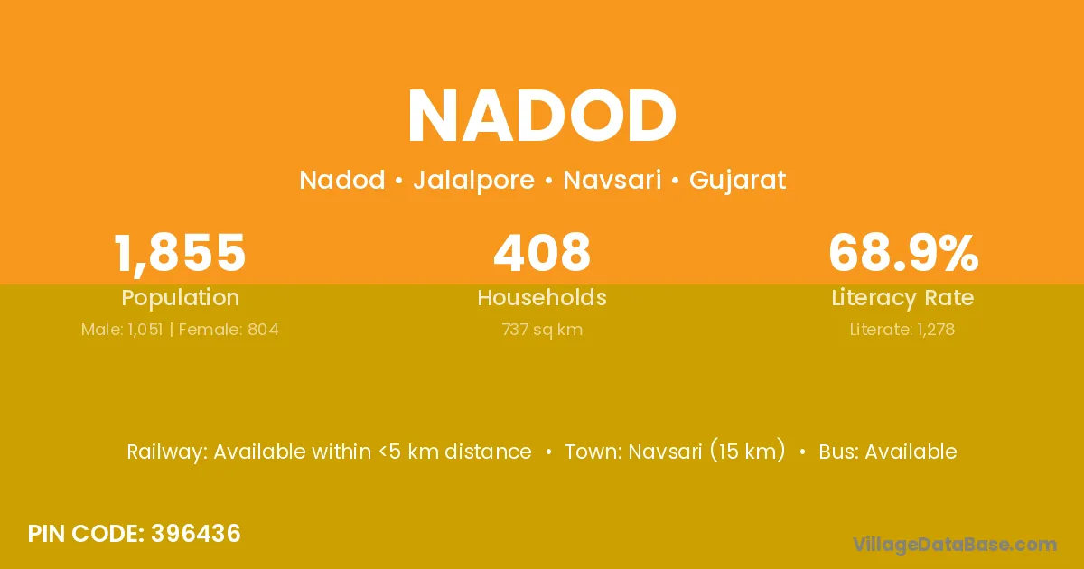 Navsari (15 km) is the nearest town to Nadod village for major economic activities and is located approximately 15 km away.