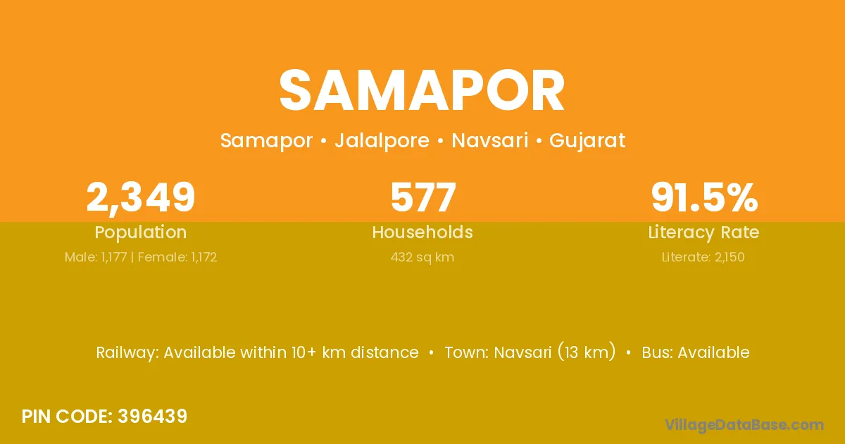 Navsari (13 km) is the nearest town to Samapor village for major economic activities and is located approximately 13 km away.