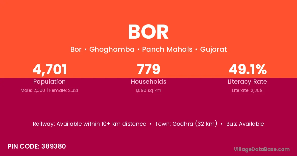 Godhra (32 km) is the nearest town to Bor village for major economic activities and is located approximately 32 km away.