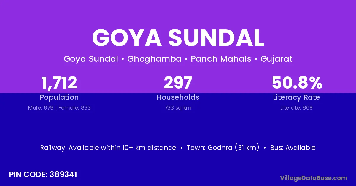 Godhra (31 km) is the nearest town to Goya Sundal village for major economic activities and is located approximately 31 km away.