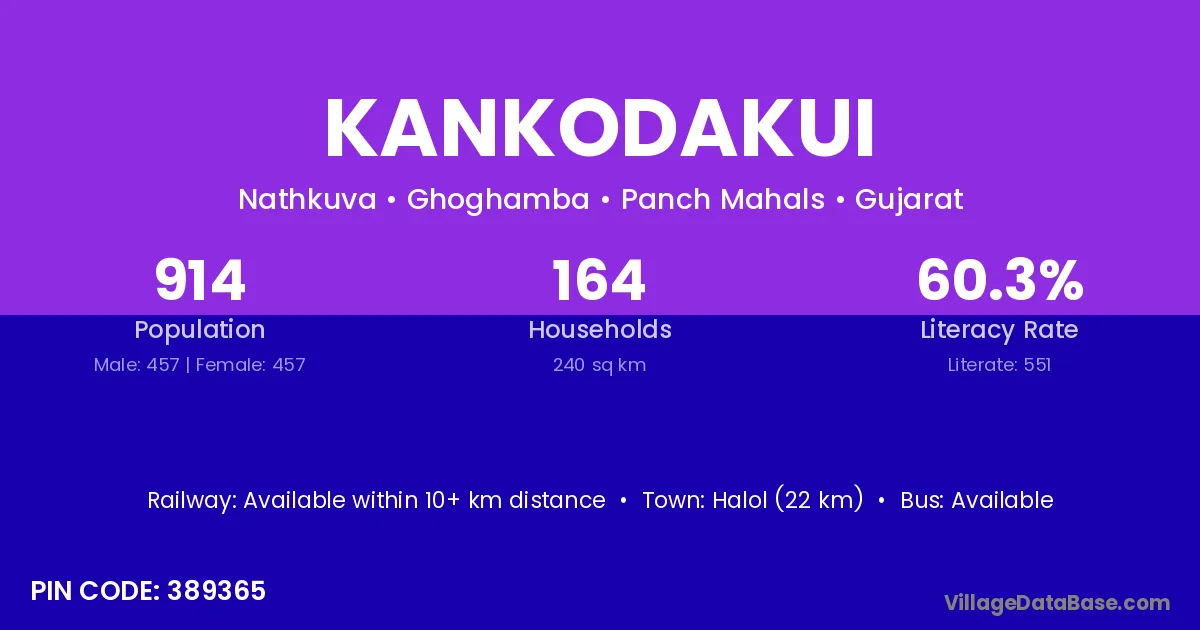 Halol (22 km) is the nearest town to Kankodakui village for major economic activities and is located approximately 22 km away.