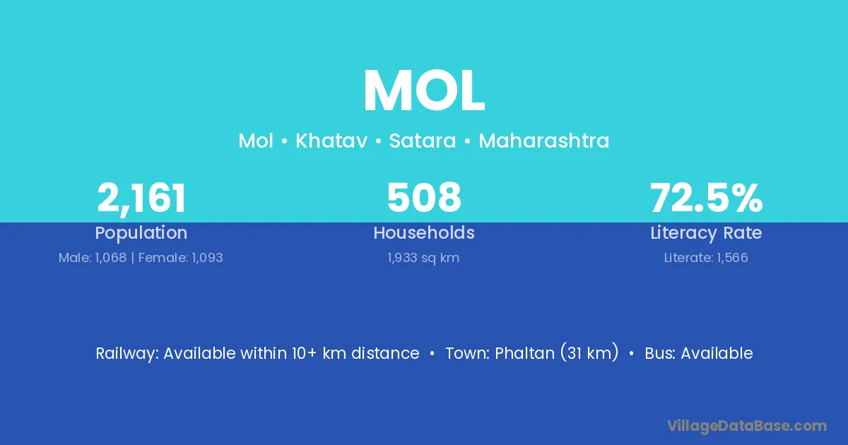 Devgadbaria (18 km) is the nearest town to Mol village for major economic activities and is located approximately 18 km away.