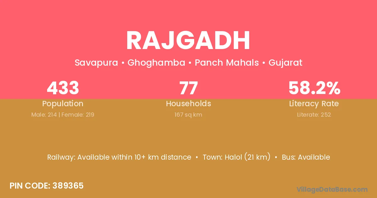 Halol (21 km) is the nearest town to Rajgadh village for major economic activities and is located approximately 21 km away.