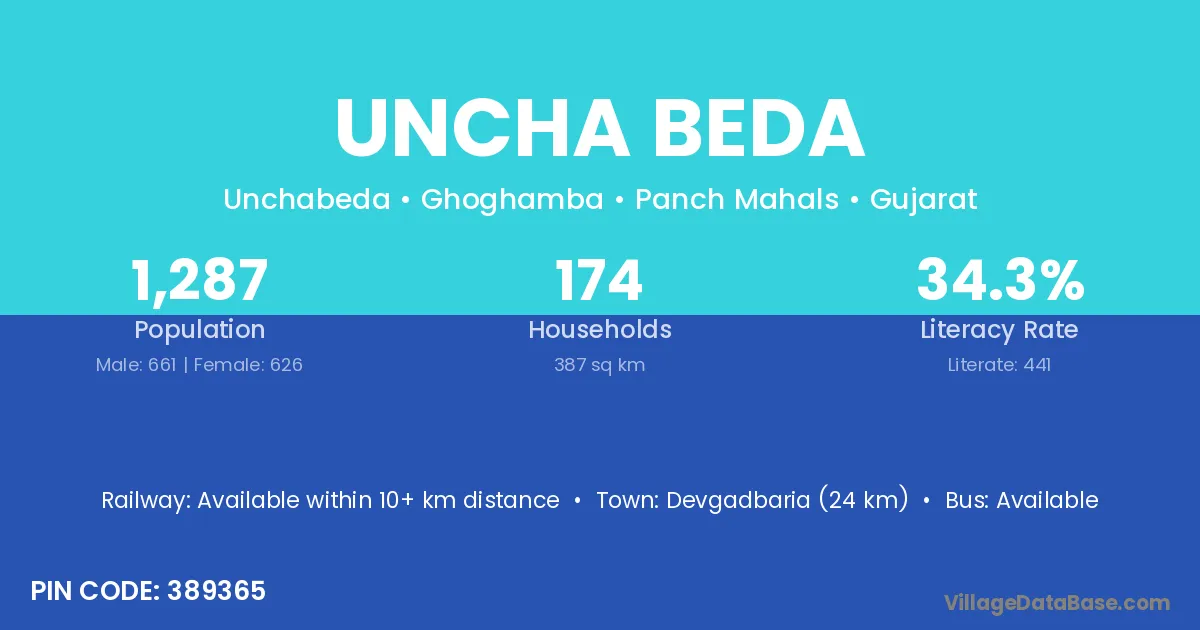 Devgadbaria (24 km) is the nearest town to Uncha Beda village for major economic activities and is located approximately 24 km away.