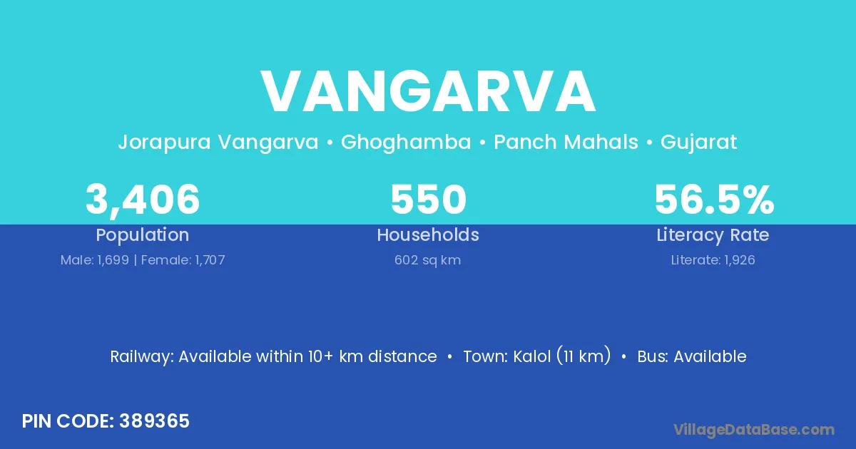 Kalol (11 km) is the nearest town to Vangarva village for major economic activities and is located approximately 11 km away.