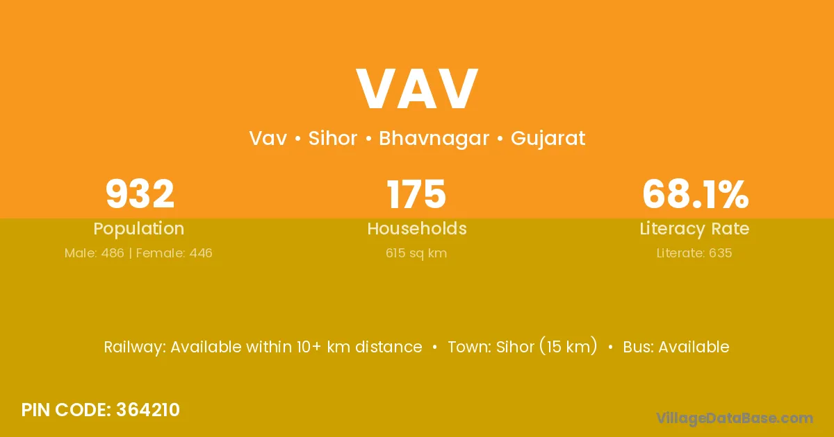 Halol (20 km) is the nearest town to Vav village for major economic activities and is located approximately 20 km away.