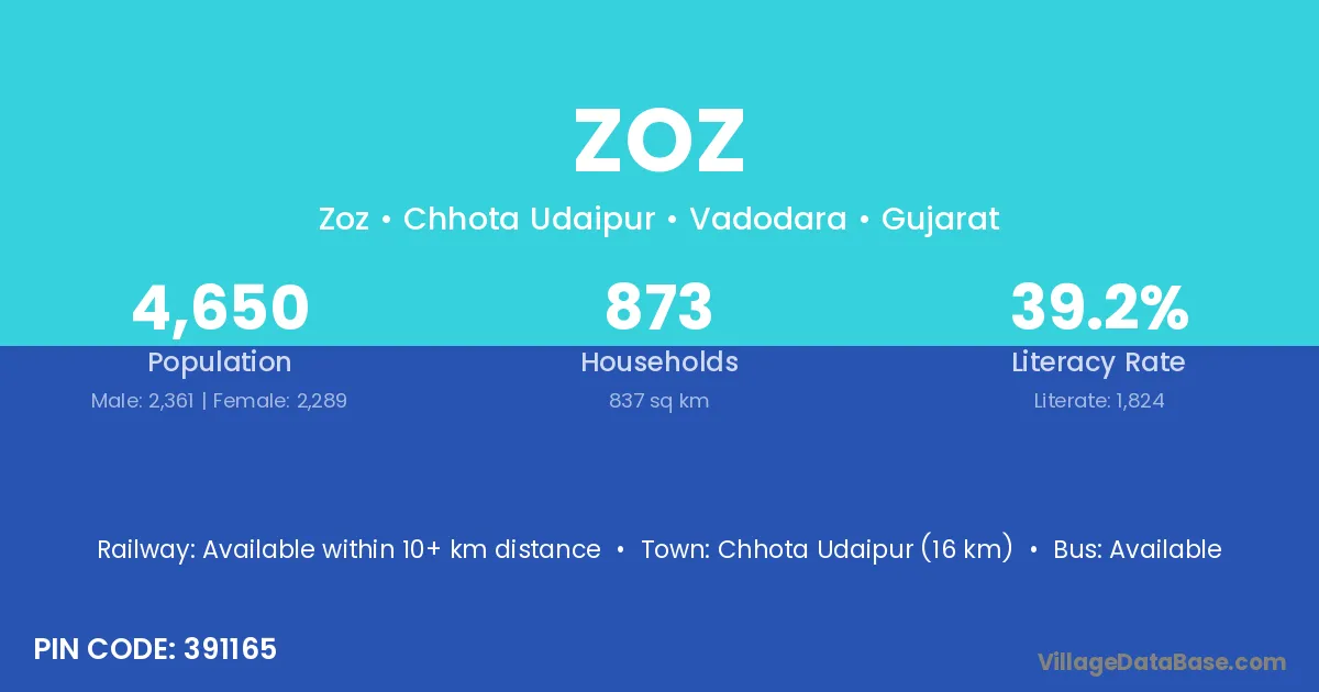 Devgadbaria (17 km) is the nearest town to Zoz village for major economic activities and is located approximately 17 km away.