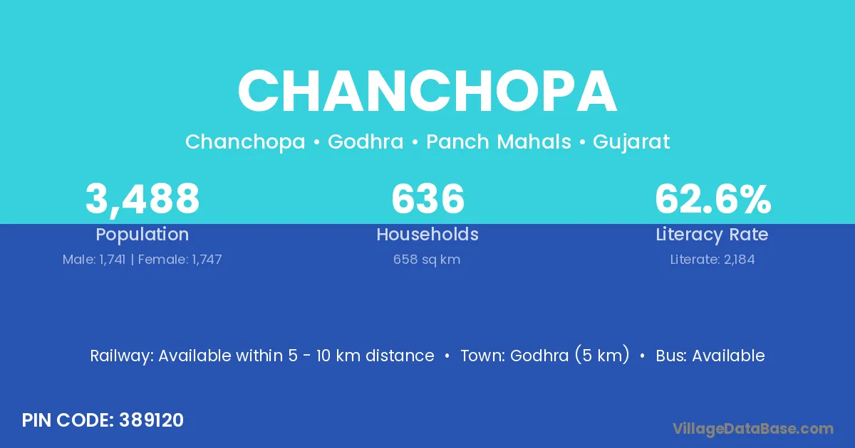 Godhra (5 km) is the nearest town to Chanchopa village for major economic activities and is located approximately 5 km away.