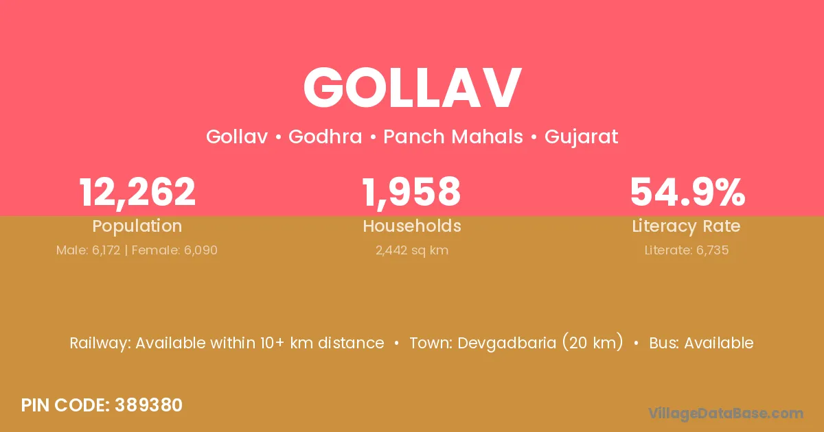 Devgadbaria (20 km) is the nearest town to Gollav village for major economic activities and is located approximately 20 km away.