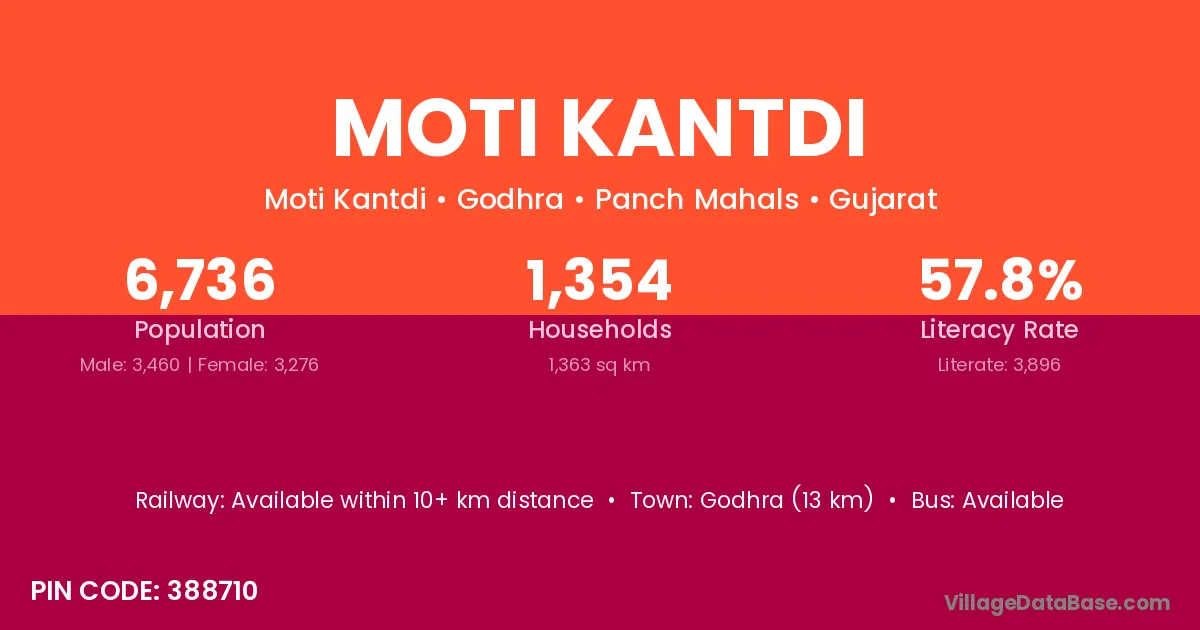Godhra (13 km) is the nearest town to Moti Kantdi village for major economic activities and is located approximately 13 km away.