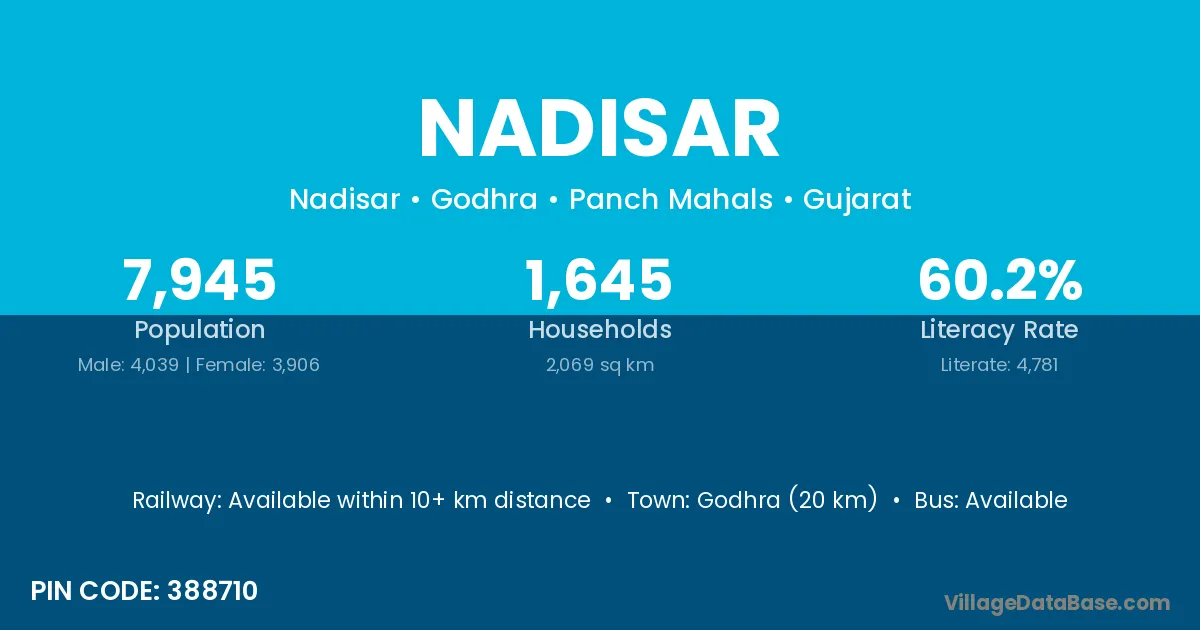 Godhra (20 km) is the nearest town to Nadisar village for major economic activities and is located approximately 20 km away.