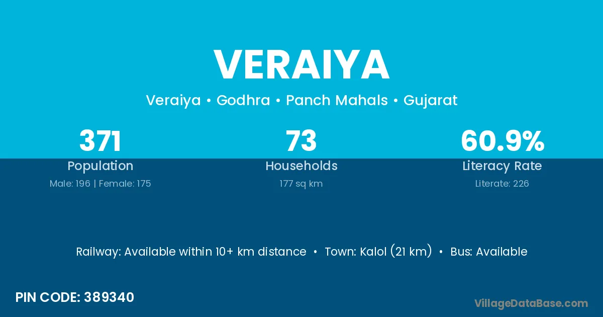 Kalol (21 km) is the nearest town to Veraiya village for major economic activities and is located approximately 21 km away.