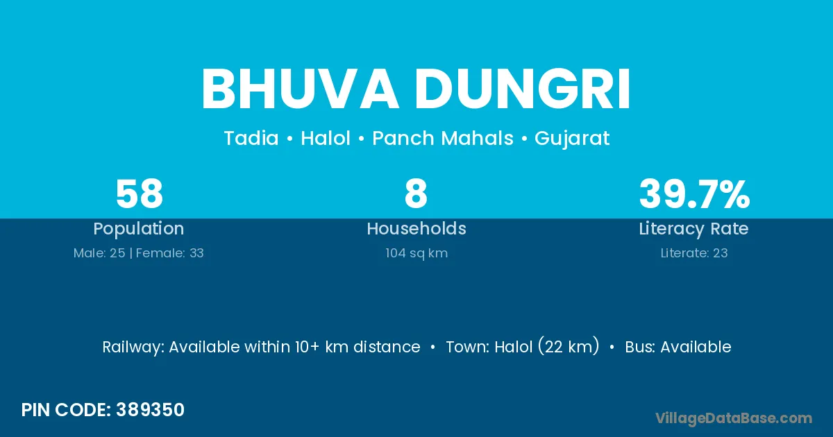 Halol (22 km) is the nearest town to Bhuva Dungri village for major economic activities and is located approximately 22 km away.