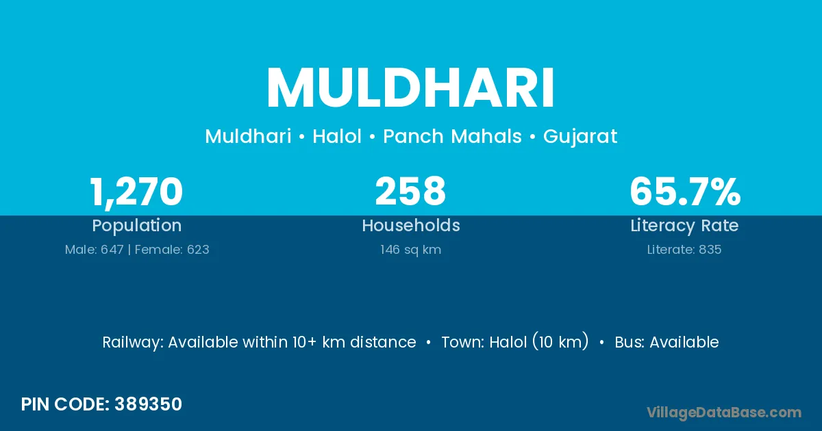 Halol (10 km) is the nearest town to Muldhari village for major economic activities and is located approximately 10 km away.