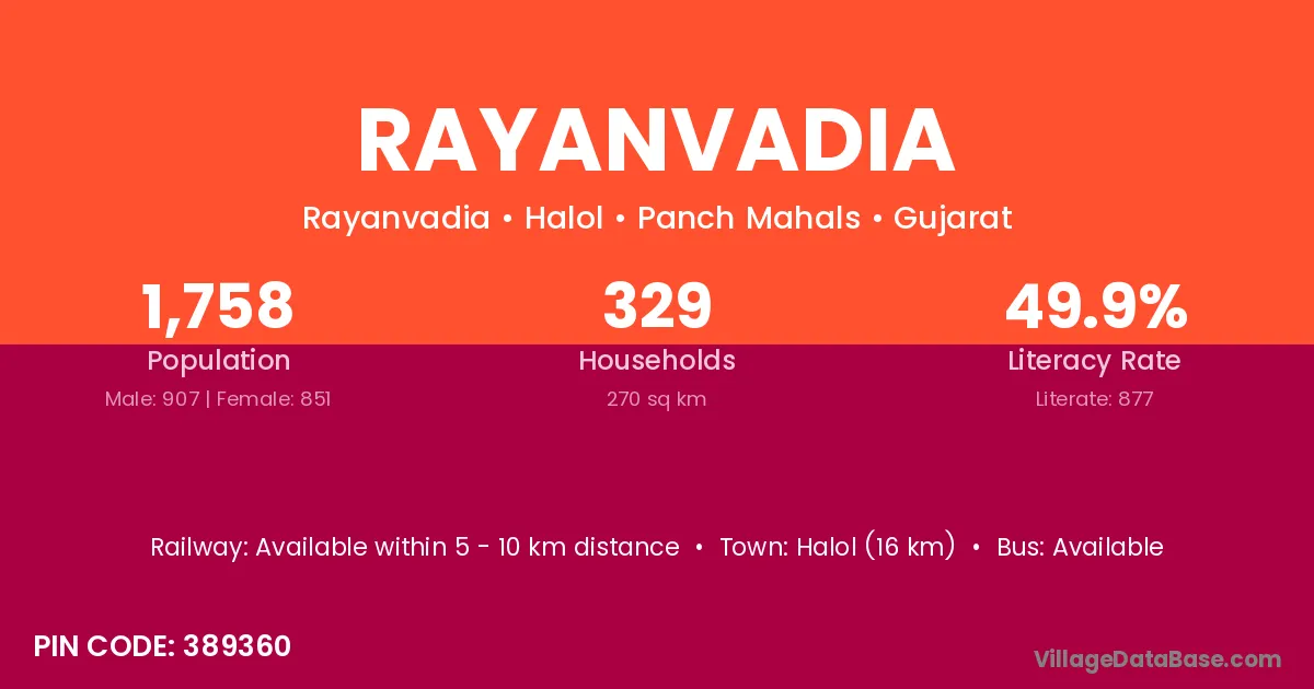 Halol (16 km) is the nearest town to Rayanvadia village for major economic activities and is located approximately 16 km away.