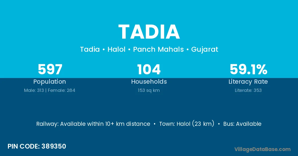 Halol (23 km) is the nearest town to Tadia village for major economic activities and is located approximately 23 km away.
