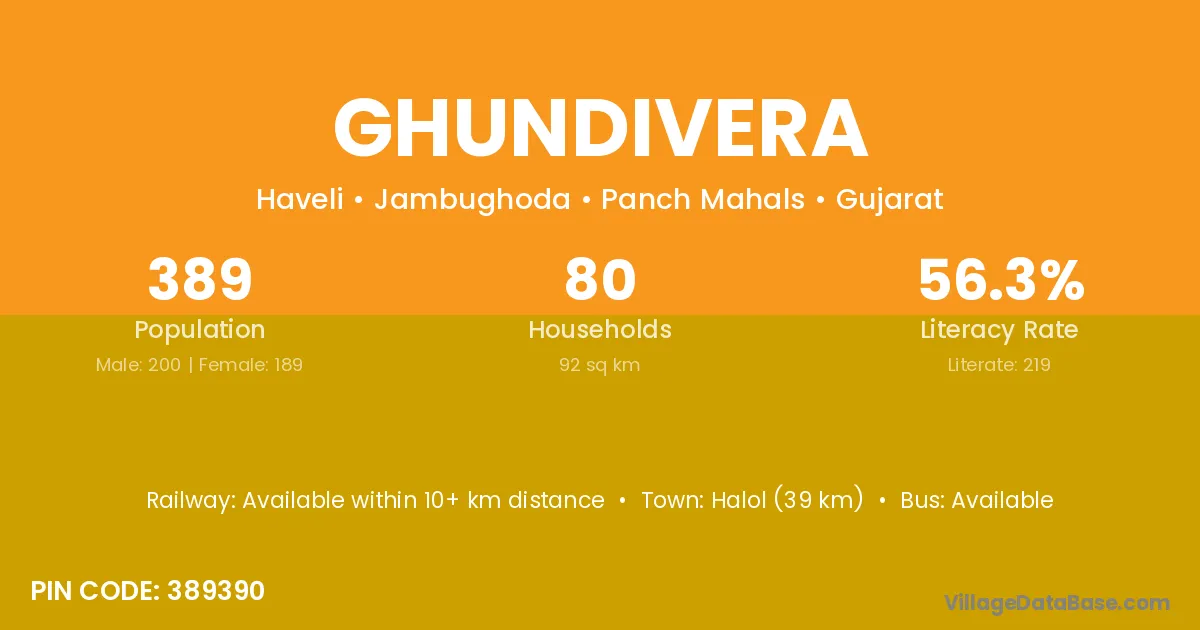 Halol (39 km) is the nearest town to Ghundivera village for major economic activities and is located approximately 39 km away.