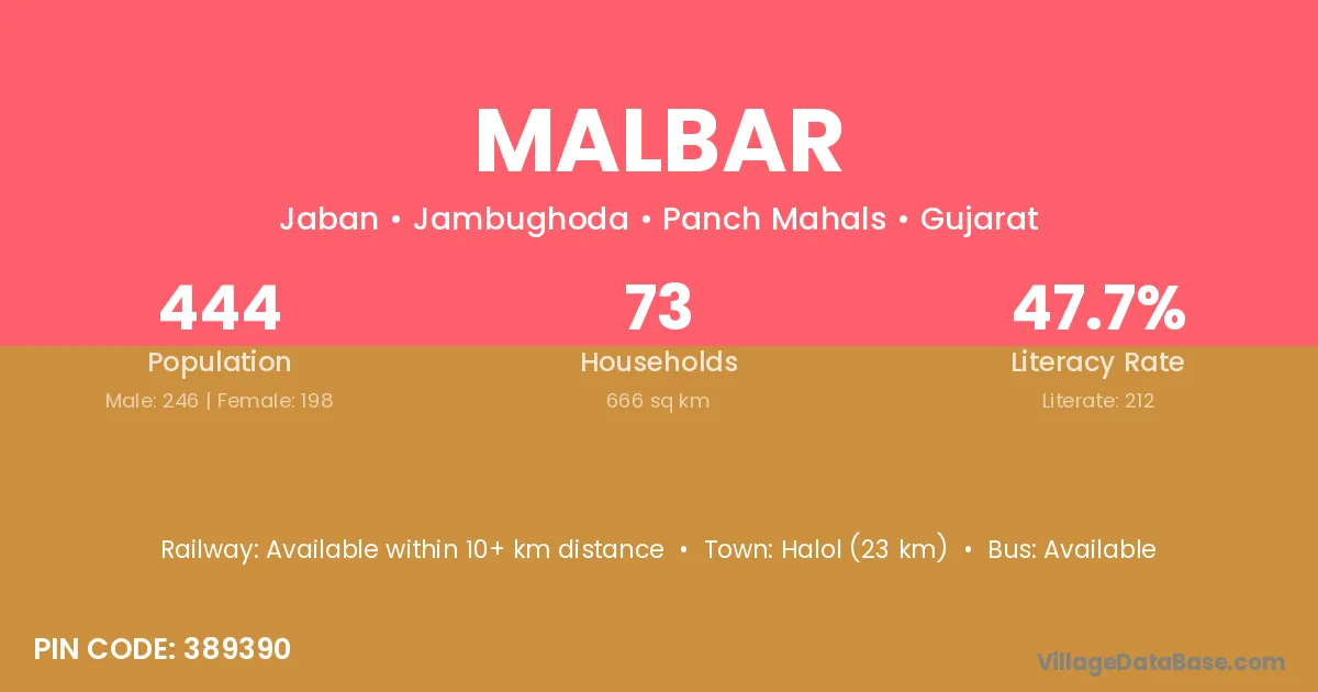 Halol (23 km) is the nearest town to Malbar village for major economic activities and is located approximately 23 km away.