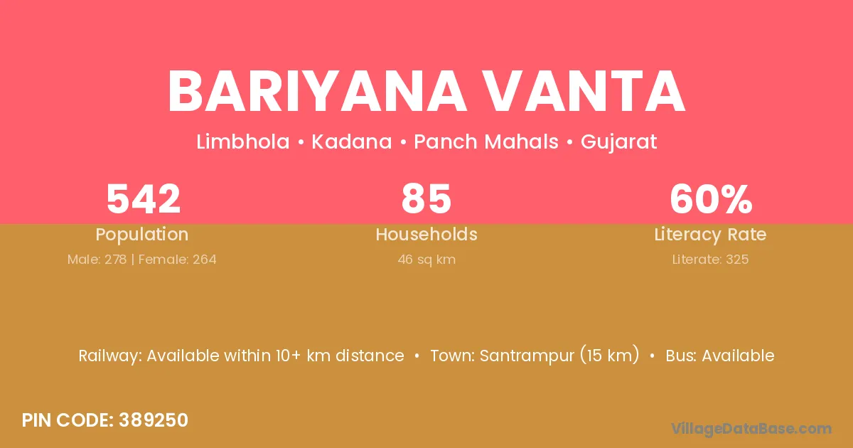 Santrampur (15 km) is the nearest town to Bariyana Vanta village for major economic activities and is located approximately 15 km away.