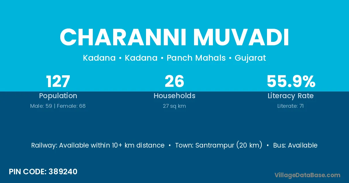 Santrampur (20 km) is the nearest town to Charanni Muvadi village for major economic activities and is located approximately 20 km away.