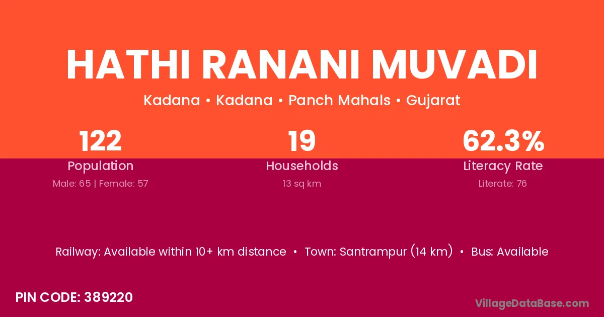 Hathi Ranani Muvadi village has a total population of 122 people, of which 65 are males and 57 are females.