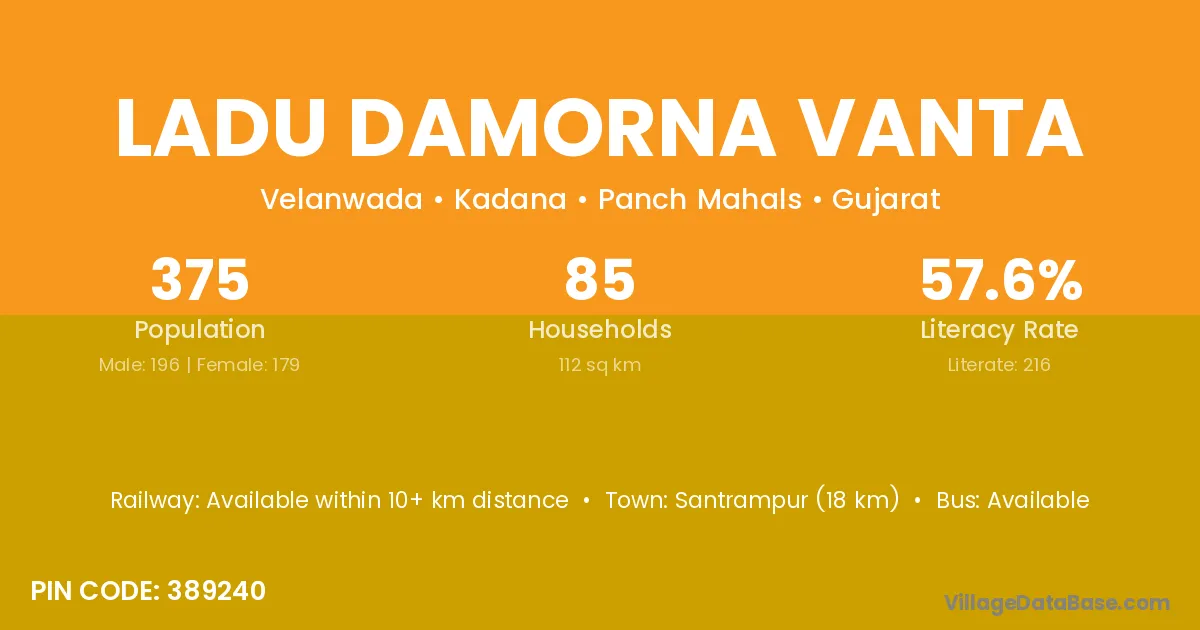 Ladu Damorna Vanta village has a total population of 375 people, of which 196 are males and 179 are females.