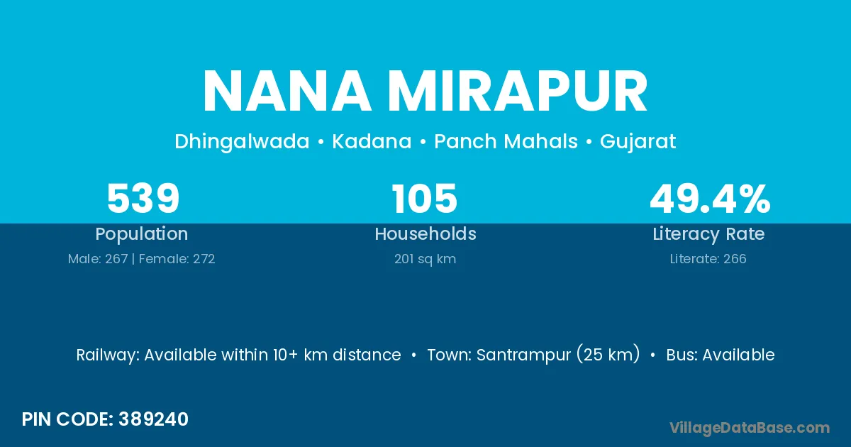 Santrampur (25 km) is the nearest town to Nana Mirapur village for major economic activities and is located approximately 25 km away.
