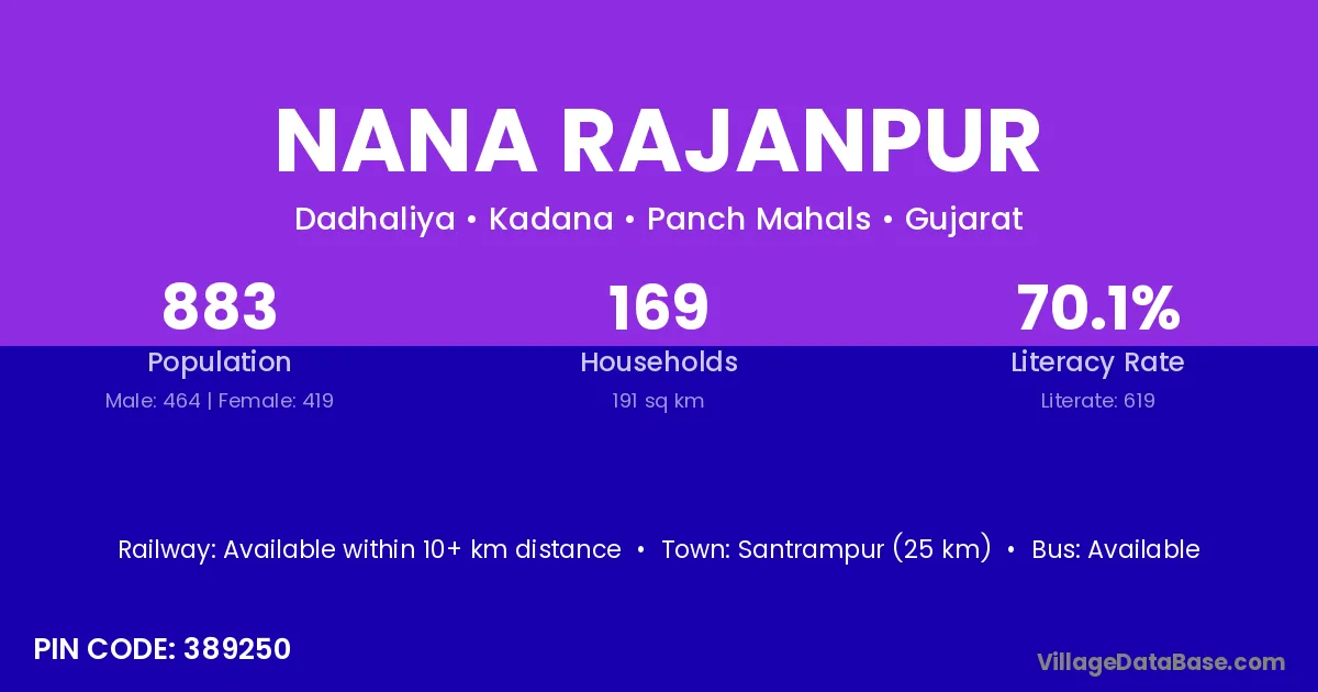 Santrampur (25 km) is the nearest town to Nana Rajanpur village for major economic activities and is located approximately 25 km away.