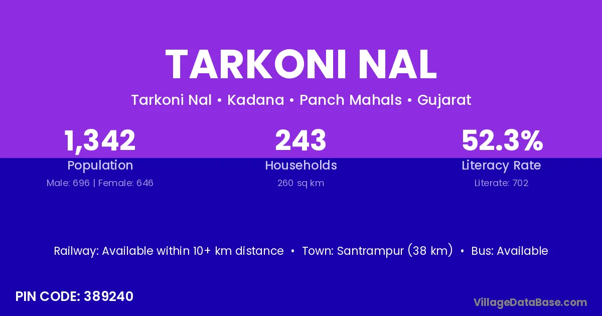 Santrampur (38 km) is the nearest town to Tarkoni Nal village for major economic activities and is located approximately 38 km away.