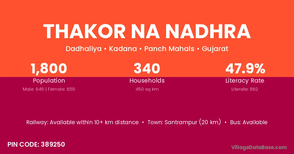 Santrampur (20 km) is the nearest town to Thakor Na Nadhra village for major economic activities and is located approximately 20 km away.