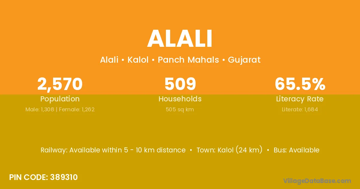 Kalol (24 km) is the nearest town to Alali village for major economic activities and is located approximately 24 km away.