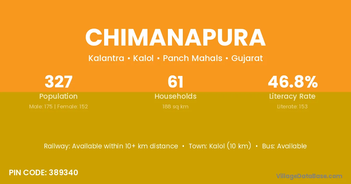 Kalol (10 km) is the nearest town to Chimanapura village for major economic activities and is located approximately 10 km away.