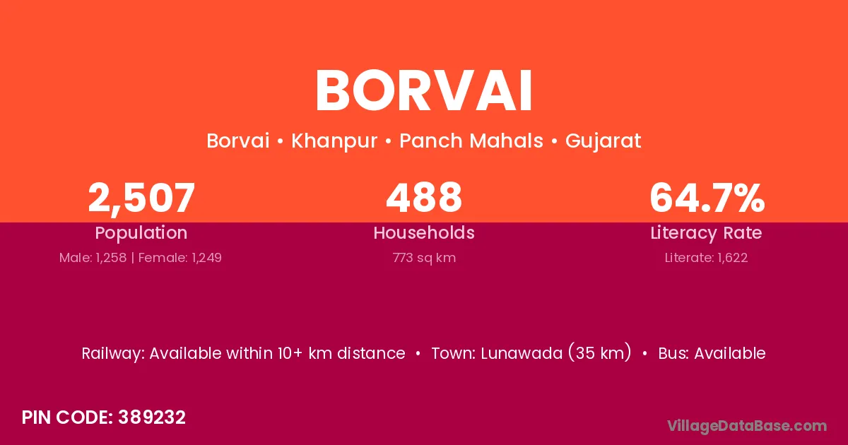 Lunawada (35 km) is the nearest town to Borvai village for major economic activities and is located approximately 35 km away.