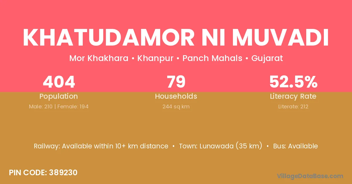 Khatudamor Ni Muvadi village has a total population of 404 people, of which 210 are males and 194 are females.