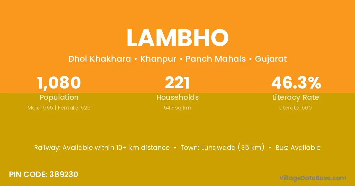 Lunawada (35 km) is the nearest town to Lambho village for major economic activities and is located approximately 35 km away.