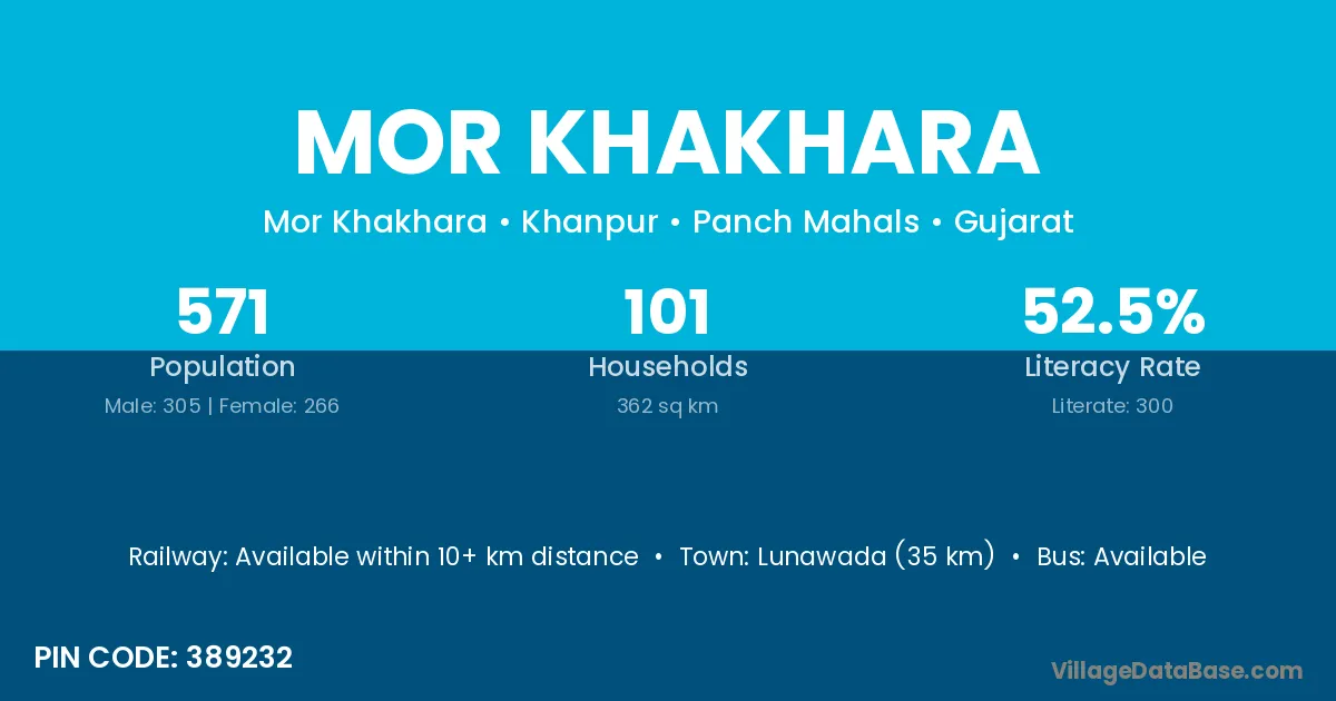 Lunawada (35 km) is the nearest town to Mor Khakhara village for major economic activities and is located approximately 35 km away.